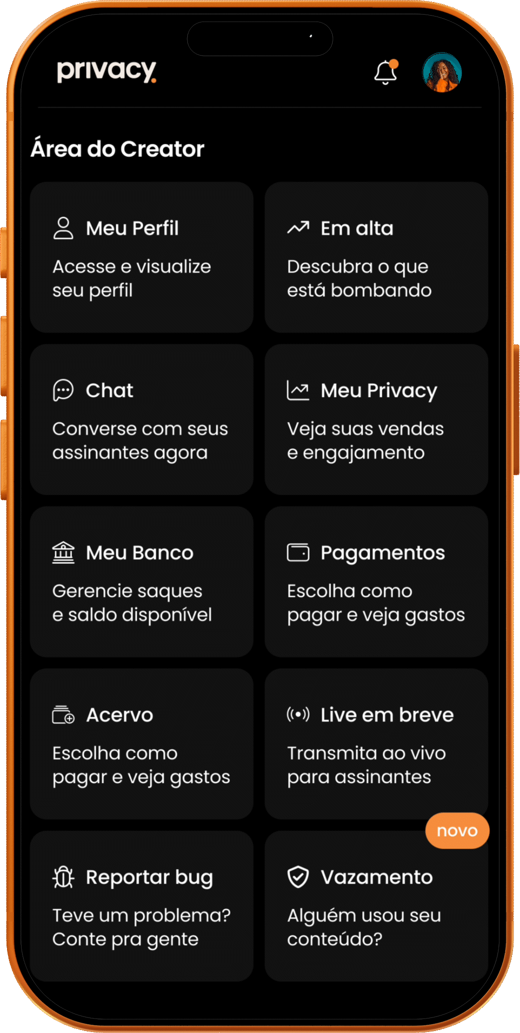 Dentro da Área do Creator, no seu painel da Privacy. Procura pelo card “Vazamento”. Ele está marcado como novo.